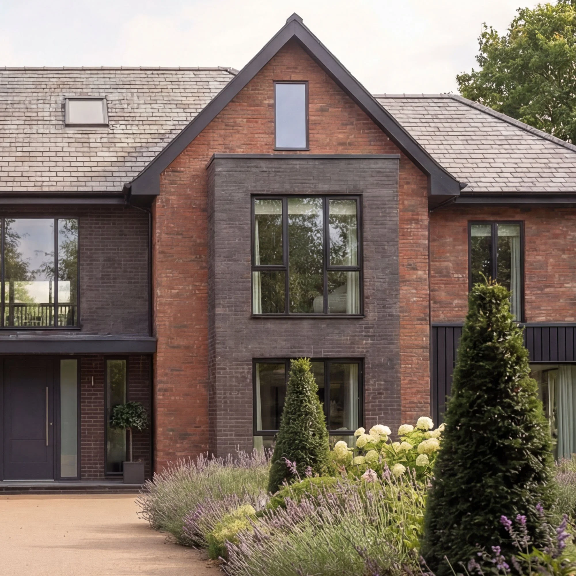 The design celebrates red brick as the primary material, complemented by black brick detailing and charred timber accents to create depth and contrast. Inside, split-level living spaces on the ground floor open up to views of the soon-to-be landscaped gardens, creating a strong connection between house and garden.